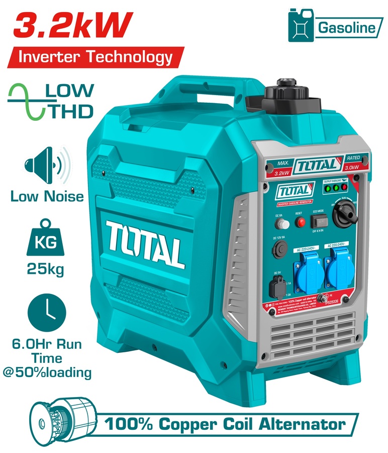 Total TP535006 Αθόρυβη Γεννήτρια Βαλιτσάκι Inverter Βενζίνης Τετράχρονη με Χειροκίνητη Μίζα και Μέγιστη Ισχύ 3.200W