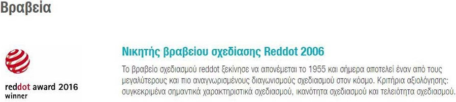 Νικητής βραβείου σχεδίασης Reddot 2017. Το βραβείο σχεδιασμού reddot ξεκίνησε να απονέμεται το 1955 και σήμερα αποτελεί έναν από τους μεγαλύτερους και πιο αναγνωρισμένους διαγωνισμούς σχεδιασμού στον κόσμο. Κριτήρια αξιολόγησης: συγκεκριμένα σημαντικά χαρακτηριστικά σχεδιασμού, ικανότητα σχεδιασμού και τελειότητα σχεδιασμού.