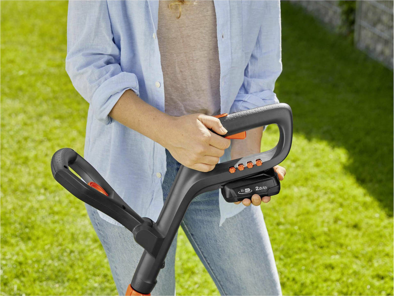 - Η ρυθμιζόμενη τηλεσκοπική λαβή επιτρέπει στο χορτοκοπτικό να προσαρμόζεται στο μέγεθος του σώματός σας, ενώ η πρόσθετη ρυθμιζόμενη λαβή εξασφαλίζει εργονομική λειτουργία.