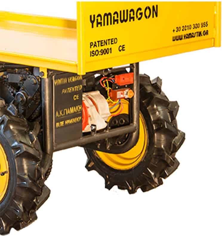 O μπροστά τροχός που περιστρέφεται γύρω από τον άξονά του, σε συνδυασμό με το καινοτόμο σύστημα στους τροχούς που λειτουργεί σαν διαφορικό, δίνει την ελευθερία στο 3κυκλο YAMAWAGON να στρίβει εύκολα και να κινείται ακόμα και στους πιο κοφτους ελιγμούς το ίδιο αξιόπιστα ακόμα και με μεγάλα φορτία.