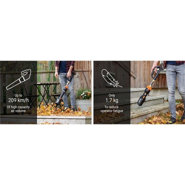 Φυσητήρας χειρός της εταιρείας Worx, με λειτουργία μπαταρίας 20V. Χρησιμοποιείται για καθαρισμό εξωτερικού χώρου όπως κήπος, δρόμος, πάρκο και βεράντα από πεσμένα φύλλα, υπολείμματα φυτοφραχτών ή του γκαζόν και άλλου είδους ρυπών που μπορούν να αφαιρεθούν με εφαρμογή αέρα χάρη στην ευκολία πρόσβασης που διαθέτει σε δύσβατα σημεία και γωνίες. Ενδείκνυται για ερασιτεχνική και επαγγελματική χρήση λόγω της αυτονομίας σε τροφοδοσία. Έχει δυνατότητα προσαρμογής της έντασης του αέρα σε χαμηλότερα επίπεδα που το καθιστά κατάλληλο και για άλλες εργασίες όπως καθαρισμός αυτοκινήτου ή υπολογιστή.