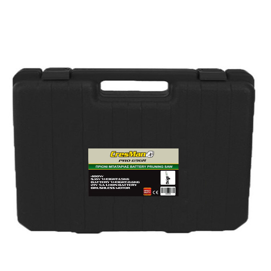 Η συσκευασία περιλαμβάνει: Βαλίτσα με αλυσοπρίονο , φoρτιστή, εργαλεία-λιπαντικά-τροχιστικά