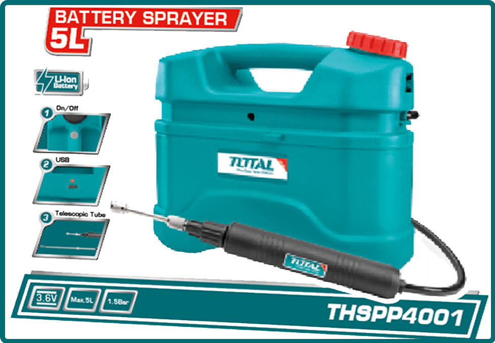 Ψεκαστήρας μπαταρίας λιθίου THSPP4001 φορητός μικρός σε όγκο και ιδιαίτερα ελαφρύς στη χρήση κατάλληλος για άριστο και ομοιογενή ψεκασμό σε όλες τις επιφάνειες .Με μικρη χωρητικότητα δοχείου 5LT και πίεση 1.5 bar θα καλύψει τις ανάγκες σας χωρίς κουραση.