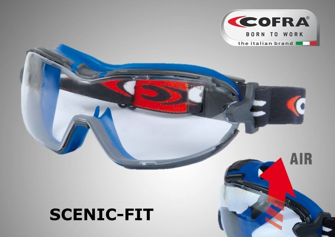 Τα γυαλιά προστασίας κλειστού τύπου (goggles) Cofra Scenic–Fit, είναι ιδανικά για να φορεθούν πάνω από διορθωτικά γυαλιά καθώς και σε παράλληλη χρήση με μάσκα αναπνοής. Με αεροδυναμικό σχήμα, φακούς από Polycarbonate και τεχνολογία 7-point bending, προσφέρουν ευρύ πεδίο όρασης χωρίς παραμόρφωση.