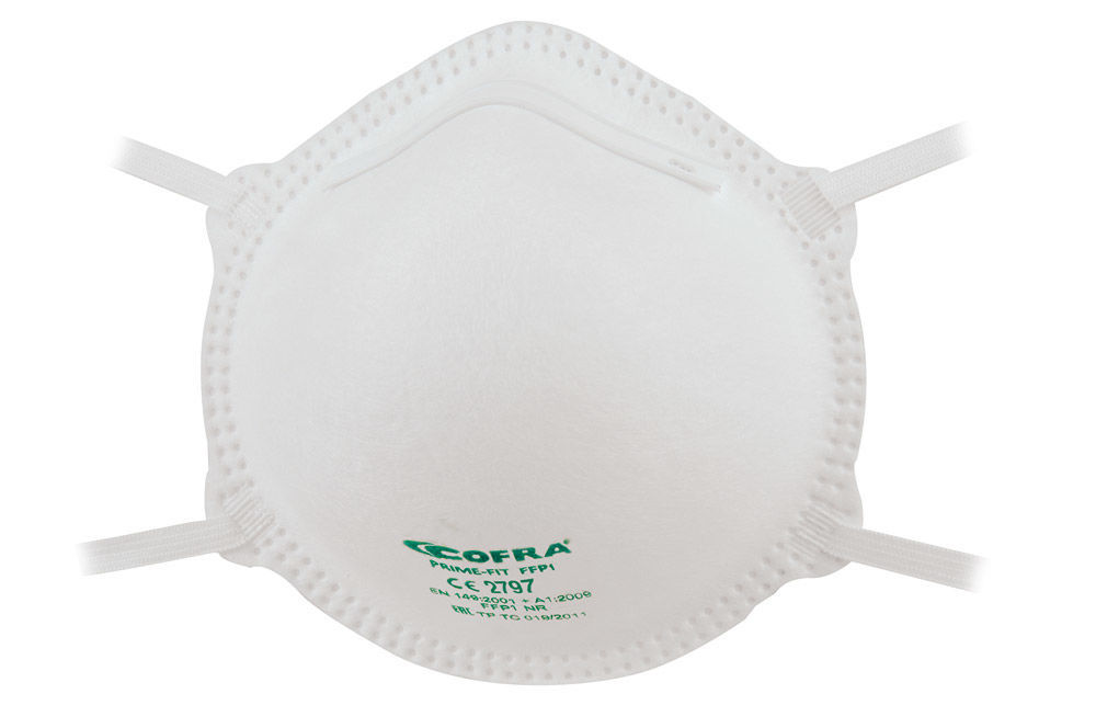 Κυπελλοειδής φιλτρομάσκα Cofra Prime-Fit FFP1. Ο εργονομικός σχεδιασμός εξασφαλίζει άριστη προσκόλληση στο πρόσωπο και άνεση σε πολύωρη χρήση. Χωρίς εκτεθειμένα μεταλλικά στοιχεία. Τα υλικά κατασκευής είναι μακράς διαρκείας και κατάλληλα για καθημερινή χρήση.