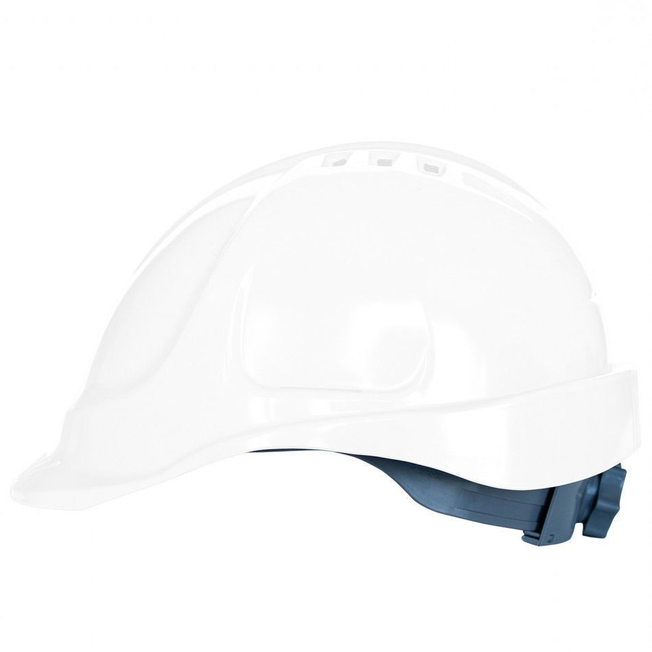Κράνος ασφαλείας λευκό από HDPE (πολυαιθυλένιο υψηλής πυκνότητας). Αεριζόμενο με 6 οπές αερισμού και με πλεξούδα κεφαλής. Διαθέτει κλείσιμο 6 σημείων με τροχαλία καστάνιας στο πίσω μέρος για ρύθμιση του μεγέθους και ζώνη ιδρώτα.