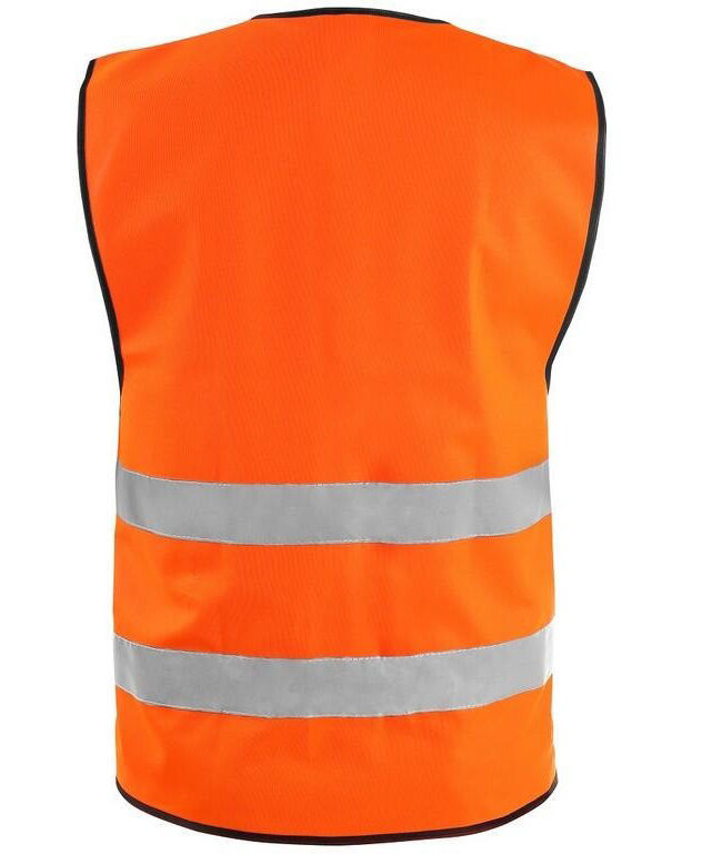 Ανακλαστικό γιλέκο εργασίας υψηλής ορατότητας – ευκρίνειας (φωσφοριζέ), πορτοκαλί χρώματος. Ρυθμιζόμενο άνοιγμα μπροστά με Velcro. 100% πολυεστερικό ύφασμα 120g/m2 με δύο οριζόντιες ανακλαστικές ταινίες (μεμβράνες).