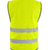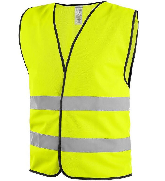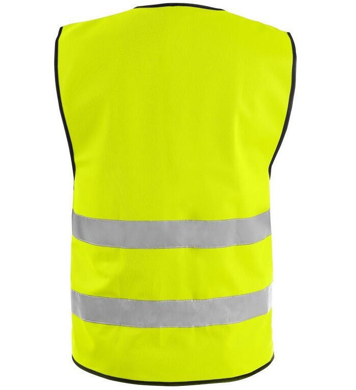 Ανακλαστικό γιλέκο εργασίας υψηλής ορατότητας – ευκρίνειας (φωσφοριζέ), κίτρινου χρώματος. Ρυθμιζόμενο άνοιγμα μπροστά με Velcro. 100% πολυεστερικό ύφασμα 120g/m2 με δύο οριζόντιες ανακλαστικές ταινίες (μεμβράνες).