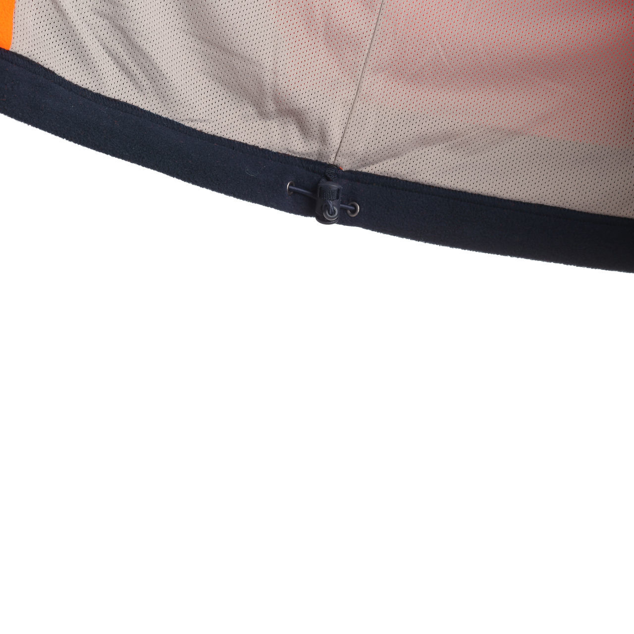 Ανακλαστική ζακέτα εργασίας υψηλής ορατότητας – ευκρίνειας (φωσφοριζέ), από 100% πολυεστερικό fleece χρώματος πορτοκαλί/μπλε. Με δύο κάθετες και δύο οριζόντιες ανακλαστικές ταινίες οι οποίες εκτείνονται και στα μανίκια. Διαθέτει λάστιχο στις μανσέτες των μανικιών, δύο τσέπες χαμηλά και μία στο στήθος που κλείνουν με φερμουάρ, ρυθμιζόμενη μέση από εσωτερικό λάστιχο και επένδυση από διχτυωτό υλικό.