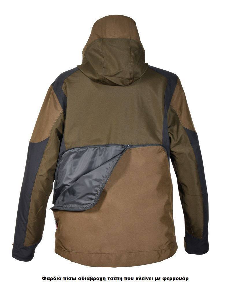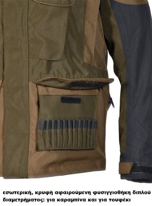 Διαθέτει 1 φυσιγγιοθήκη για καραμπίνα, 1 φυσιγγιοθήκη για τουφέκι, 2 εσωτερικές τσέπες με φερμουάρ, 2 τσέπες στο κάτω μέρος με φερμουάρ και με κρυφές εσωτερικές αφαιρούμενες φυσιγγιοθήκες, 2 φαρδιές μπροστινές τσέπες με φερμουάρ, ύφασμα ανθεκτικό στην τριβή στις περιοχές που υπόκεινται ιδιαίτερα σε καταπονήσεις, ρυθμιζόμενες μανσέτες με velcro, ρυθμιζόμενη κουκούλα αποσπώμενη και με λαστιχένια ένθετα για καλύτερη ορατότητα, ρυθμιζόμενο άνοιγμα για εξαερισμό, εργονομική σχεδίαση, πίσω μέρος από ελαστικό ύφασμα για μέγιστη ελευθερία κινήσεων, κεντρικό άνοιγμα με φερμουάρ και καπάκι, κάλυμμα με διπλό φερμουάρ, μπροστινό άνοιγμα με διπλό συρόμενο φερμουάρ, τσέπη ασυρμάτου στο στήθος, θερμοκολλημένες ραφές, αδιάβροχο ρούχο, ανθεκτικό στα αγκάθια και στην πλάτη, φαρδιά πίσω αδιάβροχη τσέπη που κλείνει με φερμουάρ.