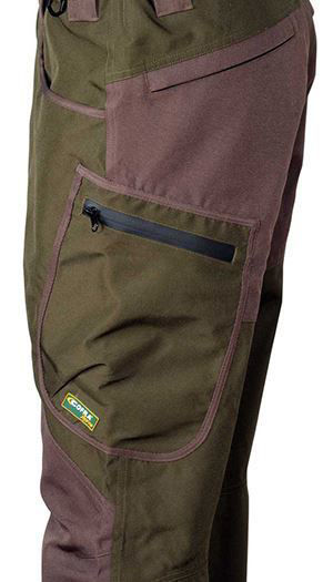 Διαθέτει 2 φαρδιές πλαϊνές τσέπες με επικαλλυμένα φερμουάρ, 2 πίσω τσέπες με φερμουάρ και καπάκι, 2 φαρδιές μπροστινές τσέπες, ύφασμα ανθεκτικό στην τριβή στις περιοχές που υπόκεινται σε μεγάλη πίεση στο μπροστινό μέρος μέχρι το κάτω πόδι, το πίσω μέρος και τους αστραγάλους, ελαστική μέση, υπερυψωμένη πίσω μέση, εργονομική σχεδίαση γονάτου και ποδιού, κουμπιά για τιράντες, θερμοκολλημένες ραφές.