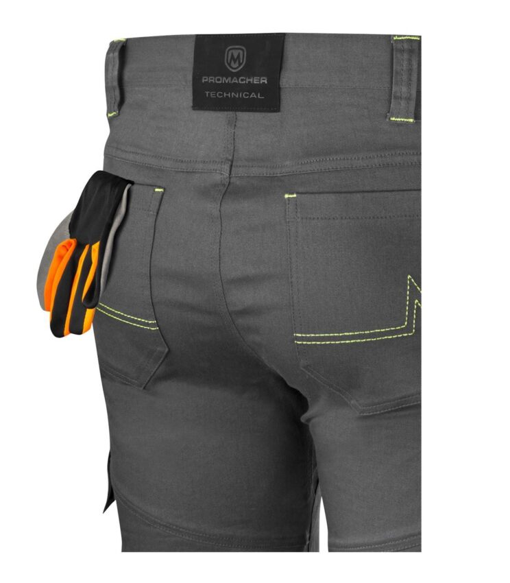 Παντελόνι Εργασίας Promacher Erebos Light grey από 98% βαμβάκι και 2% ελαστάν (spandex). Ελαφρύ (245g/m²), με στενή γραμμή και ελαστικότητα που προσφέρει άνεση κινήσεων. Δεν σακουλιάζει, με τριπλοραφές στα σημεία που δέχονται μεγαλύτερη πίεση.