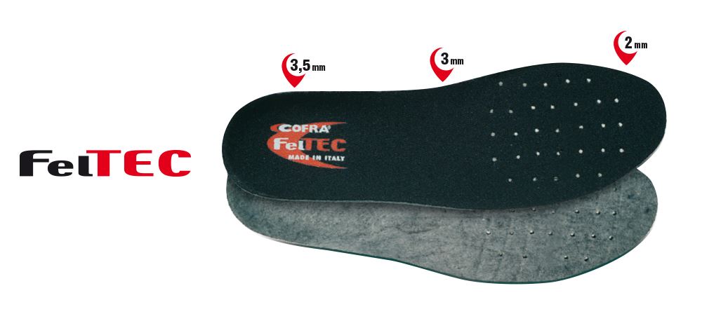 Cofra Feltec. Ανατομικός και αντιστατικός πάτος από τσόχα. Οι υφασμάτινες πιέτες στο άνω στρώμα απορροφούν τον ιδρώτα. Με οπές που βοηθούν στον απεγκλωβισμό της υγρασίας και την καλύτερη κυκλοφορία του αέρα.