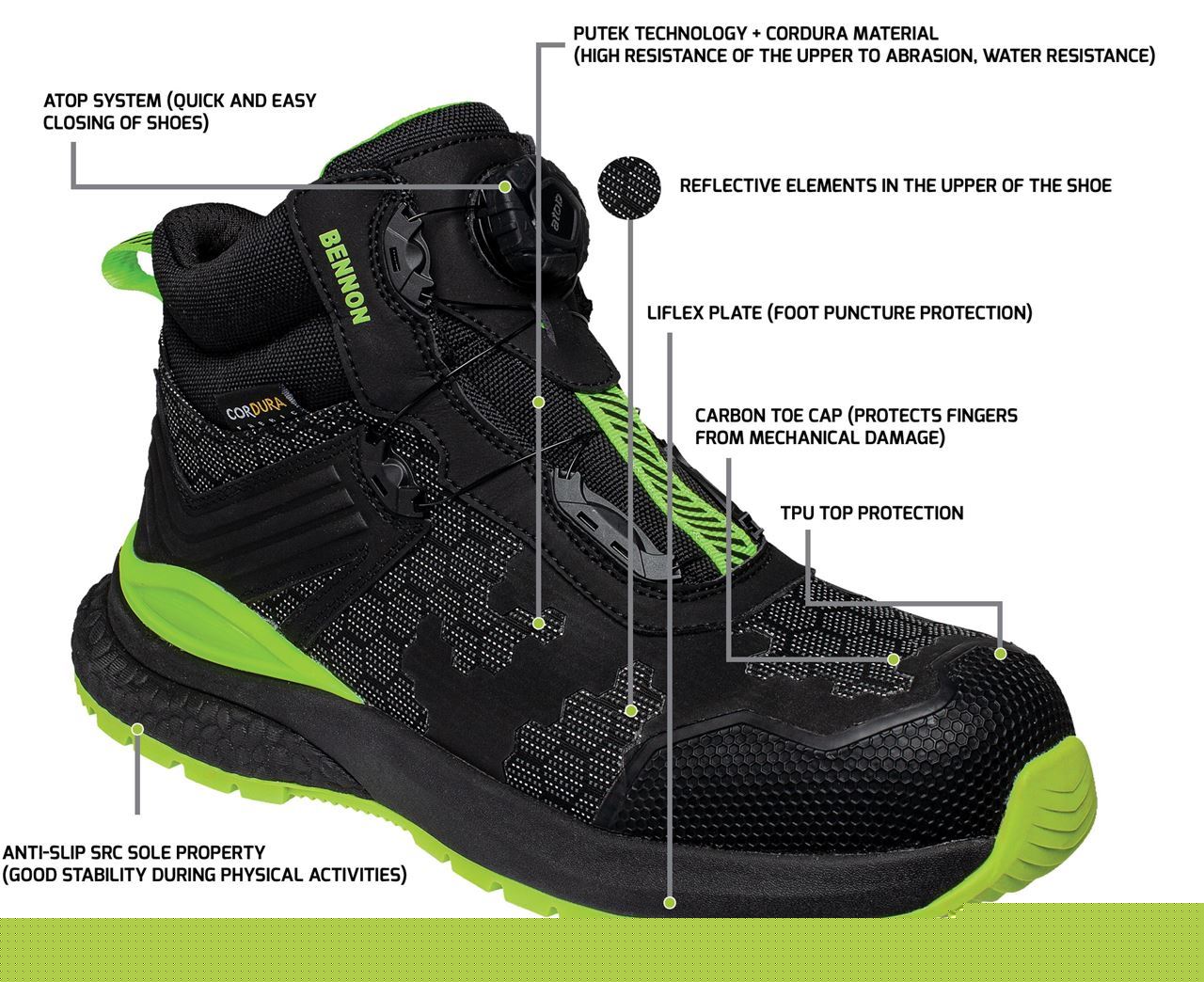 Πολύ ανθεκτικά μποτάκια ασφαλείας Bennon Predator S3 SRC HRO με αντιστατικές ιδιότητες, βάρος και προστασία κατάλληλα για εξωτερικούς και εσωτερικούς χώρους. Τα Bennon Predator αντιπροσωπεύουν μια επανάσταση στα παπούτσια ασφαλείας. Συνδυάζουν πολλά χρήσιμα χαρακτηριστικά σε ένα μοντέλο. Χαρακτηρίζονται από υψηλή αντοχή σε μηχανικές βλάβες, νερό, θερμότητα επαφής, το δέσιμο των παπουτσιών είναι εύκολο και γρήγορο. Ο ανατομικός πάτος έχει οφέλη για την υγεία για την κατάσταση του ποδιού.