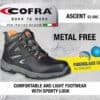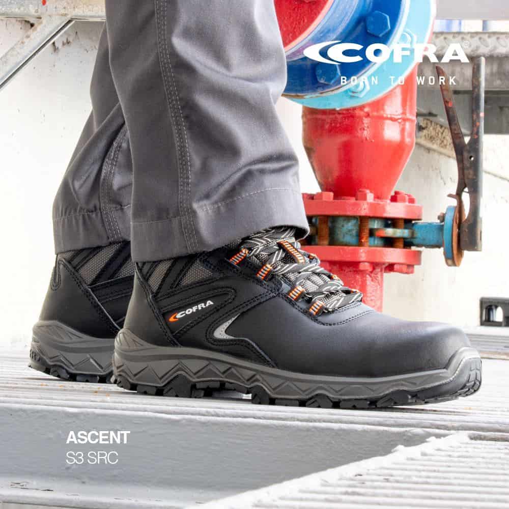 Μποτάκια ασφαλείας Cofra Ascent S3 SRC, της σειράς Training της Cofra. Ελαφριά, αδιάβροχα, χωρίς τη χρήση μεταλλικών στοιχείων στο εσωτερικό τους, με προστασία δαχτύλων από υαλούφασμα (fiberglass) και μη μεταλλική ενδιάμεση αδιάτρητη σόλα. Με καλή διαπνοή, μαλακό πάτημα, είναι αντιστατικά, αντιολισθητικά, εύκαμπτα, κρατάνε σταθερό τον αστράγαλο, εξαιρετική επιλογή που εγγυάται 100% ασφαλή εργασία.