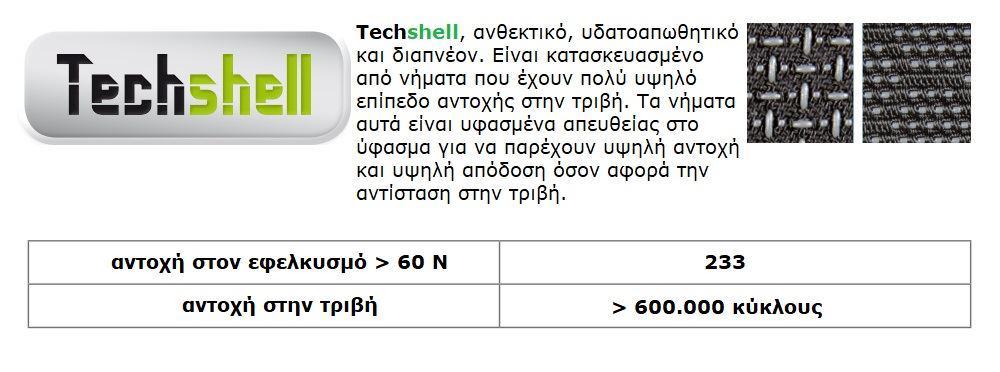 Το ύφασμα Techshell είναι καινοτόμο, ανθεκτικό στην τριβή, αδιάβροχο, η εσωτερική επένδυση από 100% πολυεστέρα Sany–dry και η αρωματική εσωτερική σόλα από πολυουρεθάνη, με διαφορετικά πάχη, διατηρούν πάντα το πόδι στεγνό και δροσερό. Η σόλα πολυουρεθάνης TPU, με ένα καλά διαμορφωμένο πέλμα, έχει εξαιρετική πρόσφυση σε οποιοδήποτε τύπο επιφάνειας και μεγαλύτερη απορρόφηση κραδασμών στη φτέρνα, αποφεύγοντας τους κραδασμούς στη σπονδυλική στήλη.