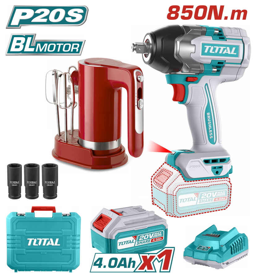 Total TOSLI240313E Σετ Μίξερ & Μπουλονόκλειδο Brushless 20V με 1 Μπαταρία 4Ah και Θήκη