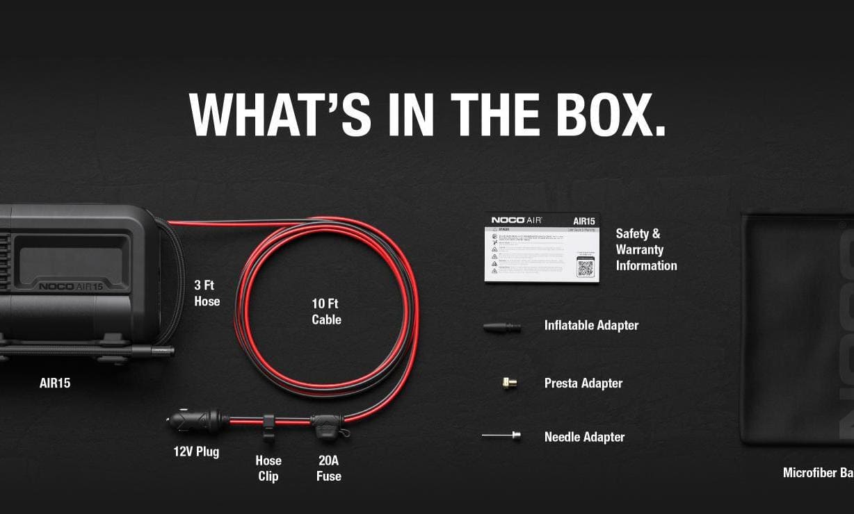 - Φορητός αεροσυμπιεστής AIR15 με εύκαμπτο σωλήνα φουσκώματος 3 ποδιών & καλώδιο ρεύματος 10 ποδιών + βύσμα αναπτήρα 12 V