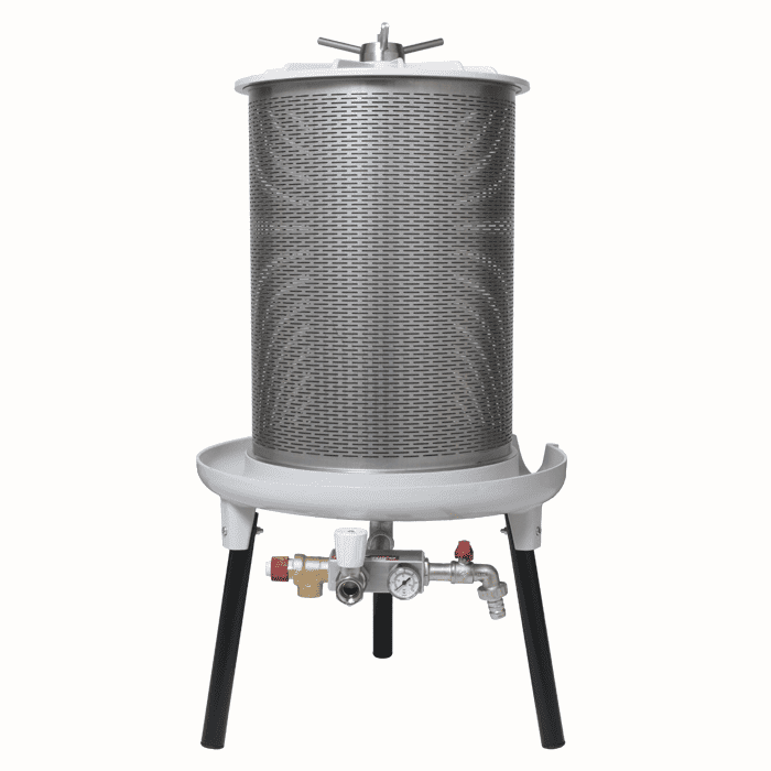 Η υδροπρέσσα 40L της Grifo είναι κατάλληλη για κεράσια, αχλάδια, μήλα και για ρόδια. Η αρχή λειτουργίας της στηρίζεται στην πίεση νερού, με την οποία διογκώνεται εσωτερικά μια σαμπρέλα ύδρευσης. Η σαμπρέλα αυτή προκαλεί πλευρικά συμπίεση του φρούτου και κατά συνέπεια το σπάσιμο και τη δημιουργία χυμού.